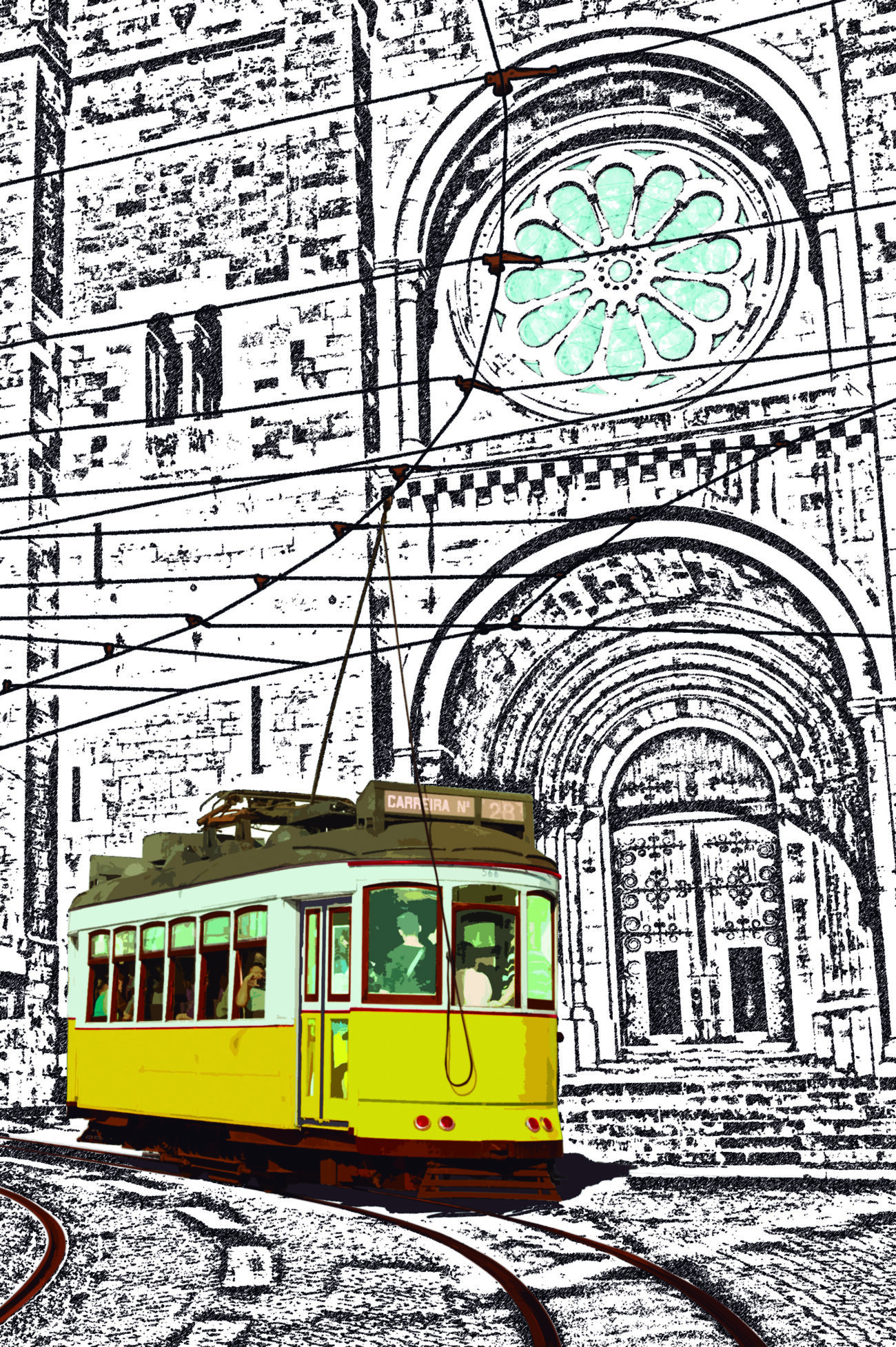 photography is the basic technique, the theme includes iconic elements of lisbon, with the application of digital processes to the original photographs with a POP aesthetic, tram 28 with the sé catedral of lisbon behind