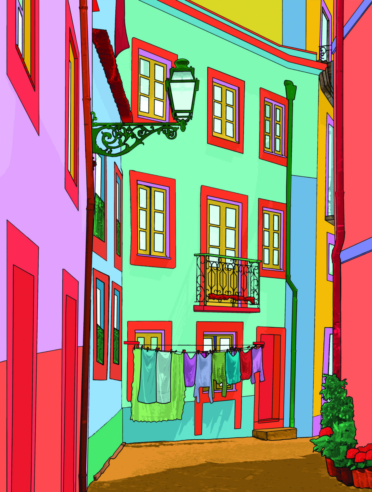 photography is the basic technique, the theme includes iconic elements of lisbon, with the application of digital processes to the original photographs with a POP aesthetic, street inside the wall of lisbon castle
