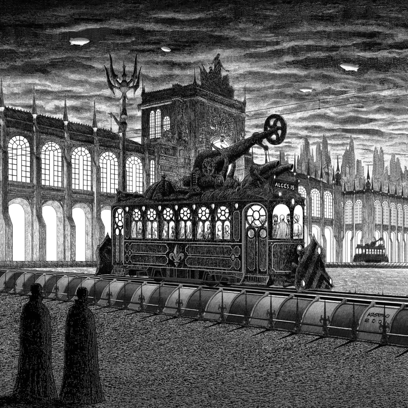O meu Terreiro do Paço com os seus Arco do Triunfo e elétrico, agora desaparecido, renasceu numa flamejante praça neogótica. No primeiro plano, as duas figuras com capas, que contemplam a partida do elétrico no final do dia, são a Nostalgia e a Saudade.