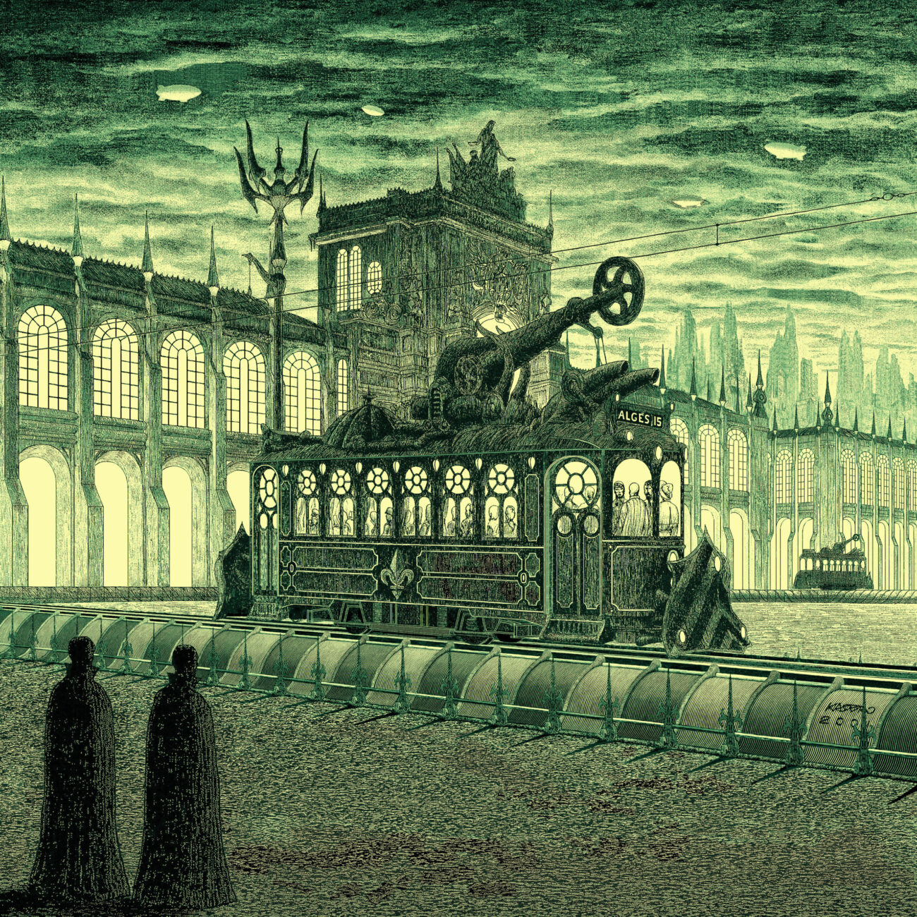 O meu Terreiro do Paço com os seus Arco do Triunfo e elétrico, agora desaparecido, renasceu numa flamejante praça neogótica. No primeiro plano, as duas figuras com capas, que contemplam a partida do elétrico no final do dia, são a Nostalgia e a Saudade.