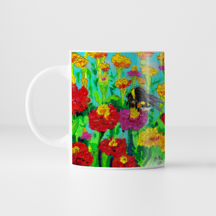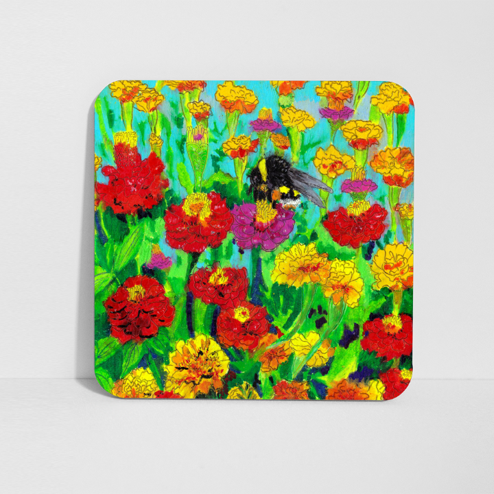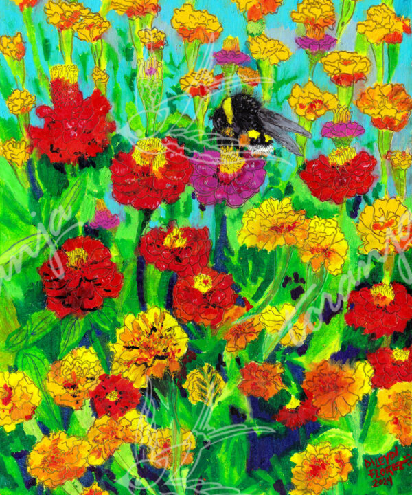 Painting inspired by our garden. Drawn among flowers planted from seeds and the insects that were attracted to them.