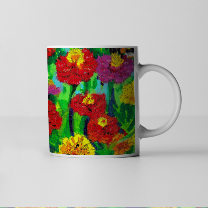 Painting inspired by our garden. Drawn among flowers planted from seeds and the insects that were attracted to them. Created using mixed media techniques.