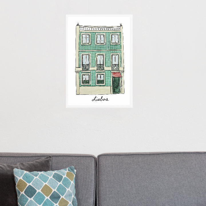 Desenho em aguarela de uma fachada de um prédio de Lisboa