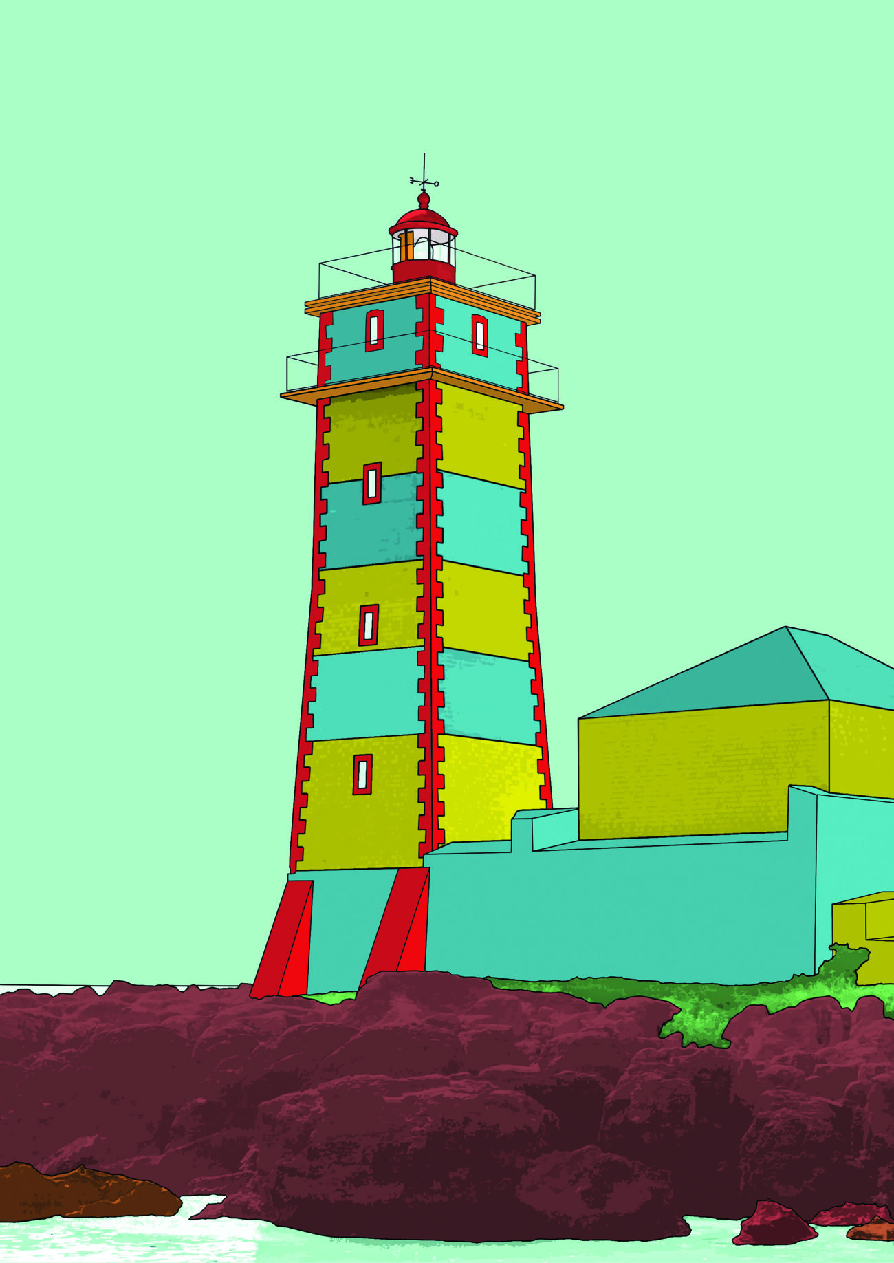 photography is the basic technique, the theme includes iconic elements of Porto, with the application of digital processes to the original photographs with a POP aesthetic, photography of the cascais, santa marta lighthouse in cascais