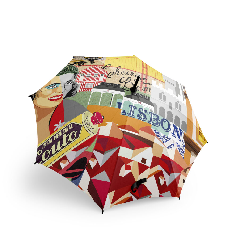 Representação da cidade de Lisboa com ilustração e colagens digitais.Composição luminosa e colorida com monumentos e ícones portugueses como Amália e o Fado.
