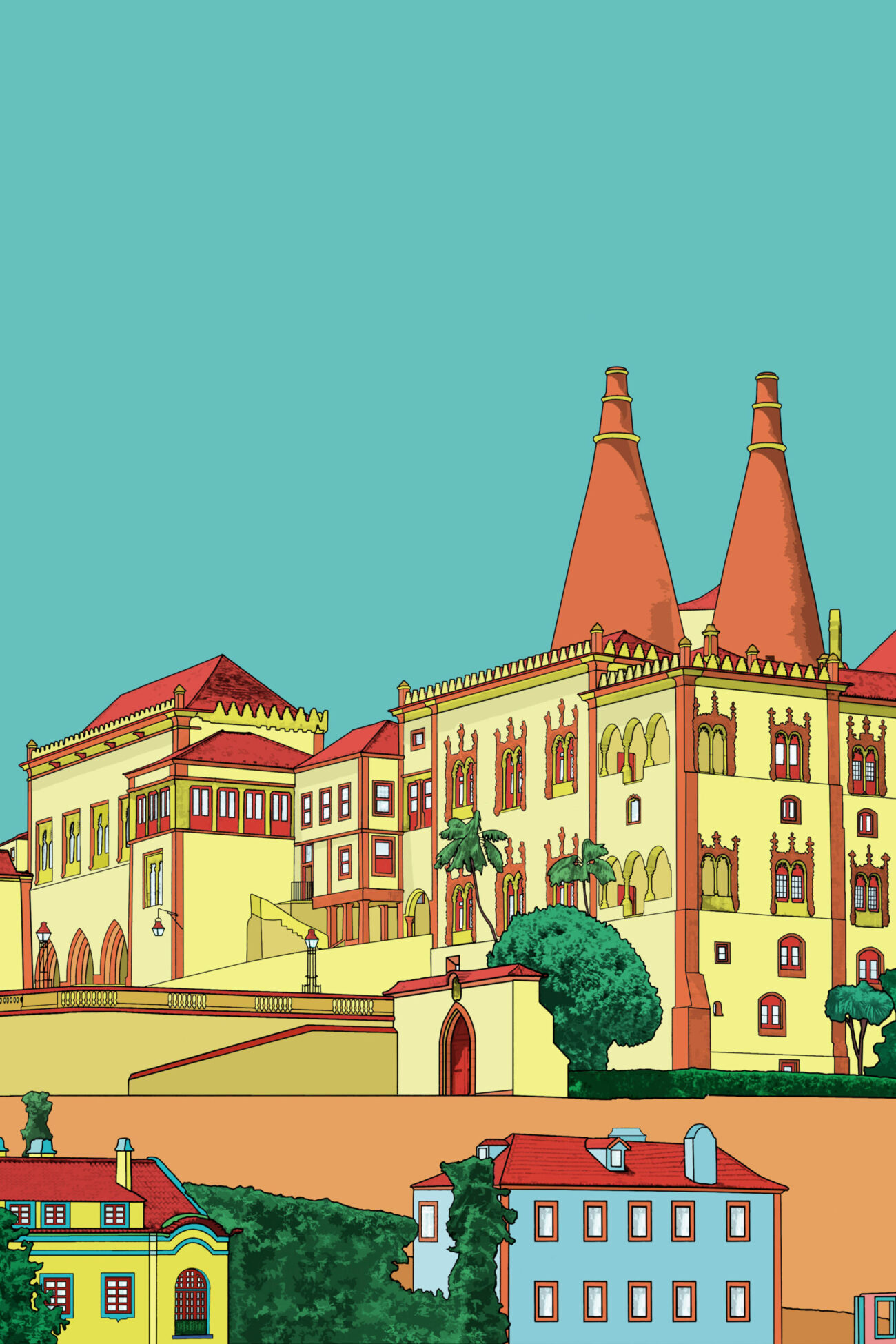 Photography is the basic technique, the theme includes iconic elements of sintra, with the application of digital processes to the original photographs with a POP aesthetic, national palace of sintra, also known as palácio da vila