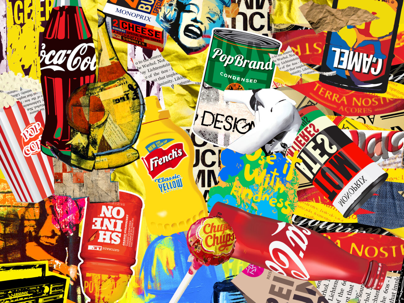 This composition is integrated into popart aesthetic, and is also a reflection of society and the world of “pop” brands. Made with illustration and digital collages.