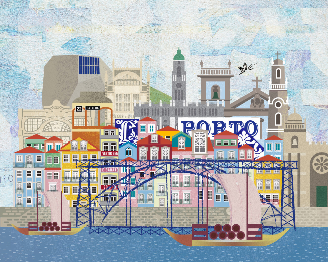 Representação da cidade do Porto com ilustração e colagens digitais.