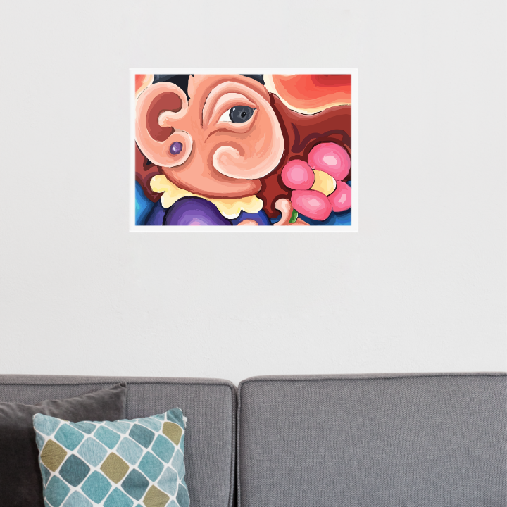 Composição vibrante e onírica. Figura estilizada, coroada em tons escuros, que oferece uma flor abstrata e marcante. Traços exagerados, linhas ondulantes e cores intensas, explora o contraste entre vulnerabilidade e autoridade. O olhar único e expressivo sugerindo introspeção tanto quanto presença. Parte figura, parte símbolo, esta personagem transmite uma energia simultaneamente lúdica e enigmática. Um mundo sonhado, onde emoção, identidade e imaginação se entrelaçam.